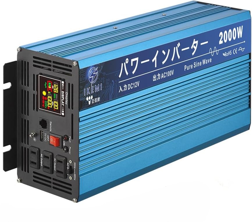 2000W 12V→100Vインバータは、車やバッテリー電源を家庭用100Vに変換する高出力インバータです。